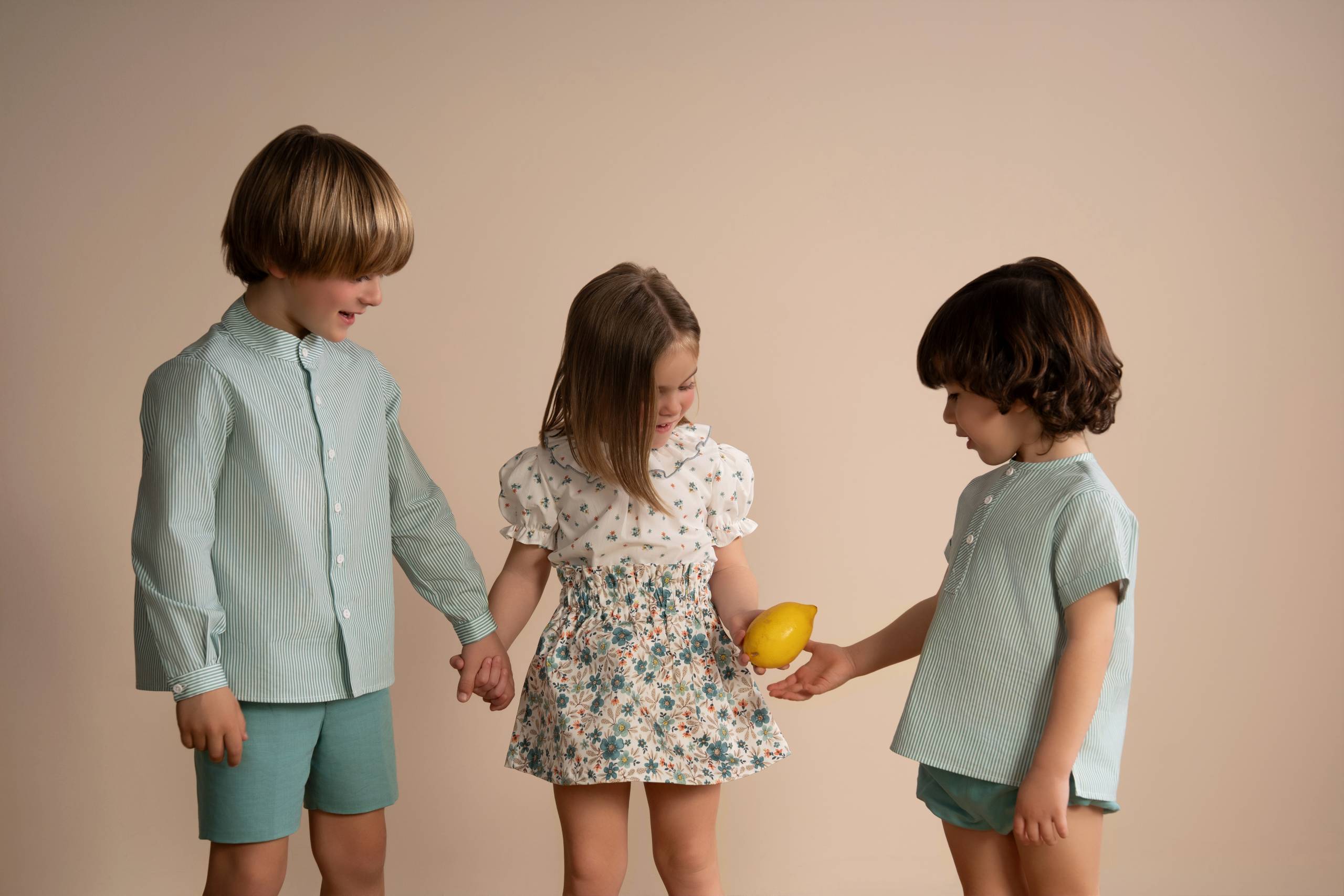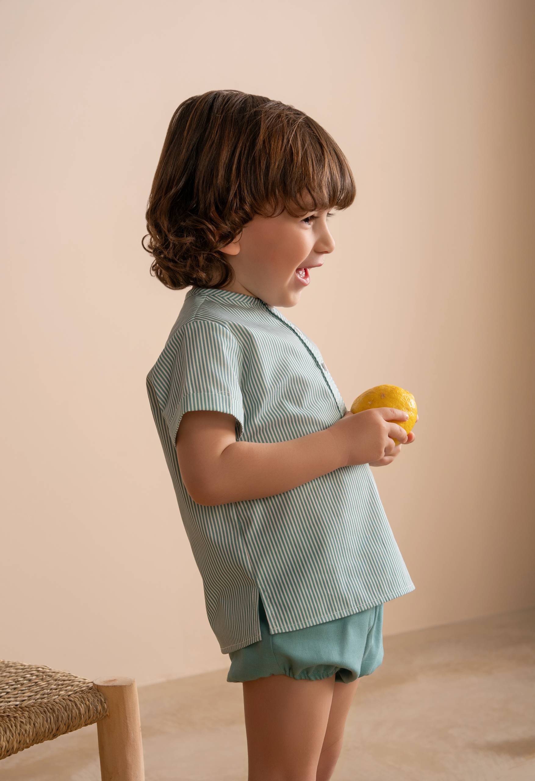 Conjunto de diseño clásico con camisa de rayas en tono verde azulado y cubrepañal a juego. Confeccionado en 100% algodón. Fabricado en España por la marca Paloma de la O.