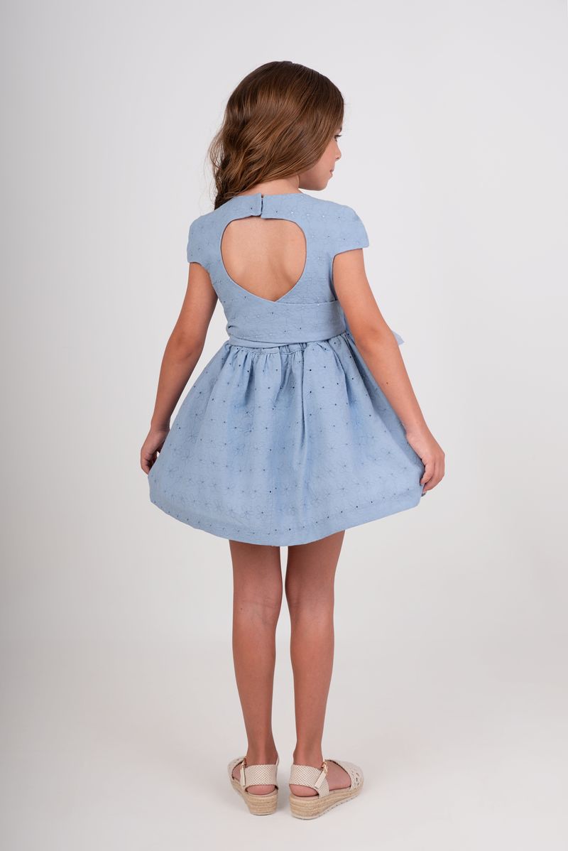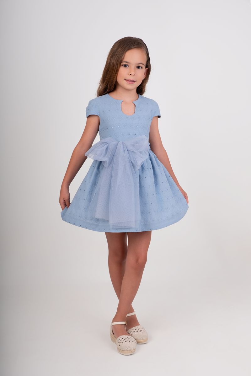 Vestido infantil de la marca Nekenia, diseñado para ocasiones especiales con un estilo elegante y delicado. Confeccionado en un suave tejido en tono azul empolvado, destaca por su acabado sutilmente texturizado que aporta un toque sofisticado.
