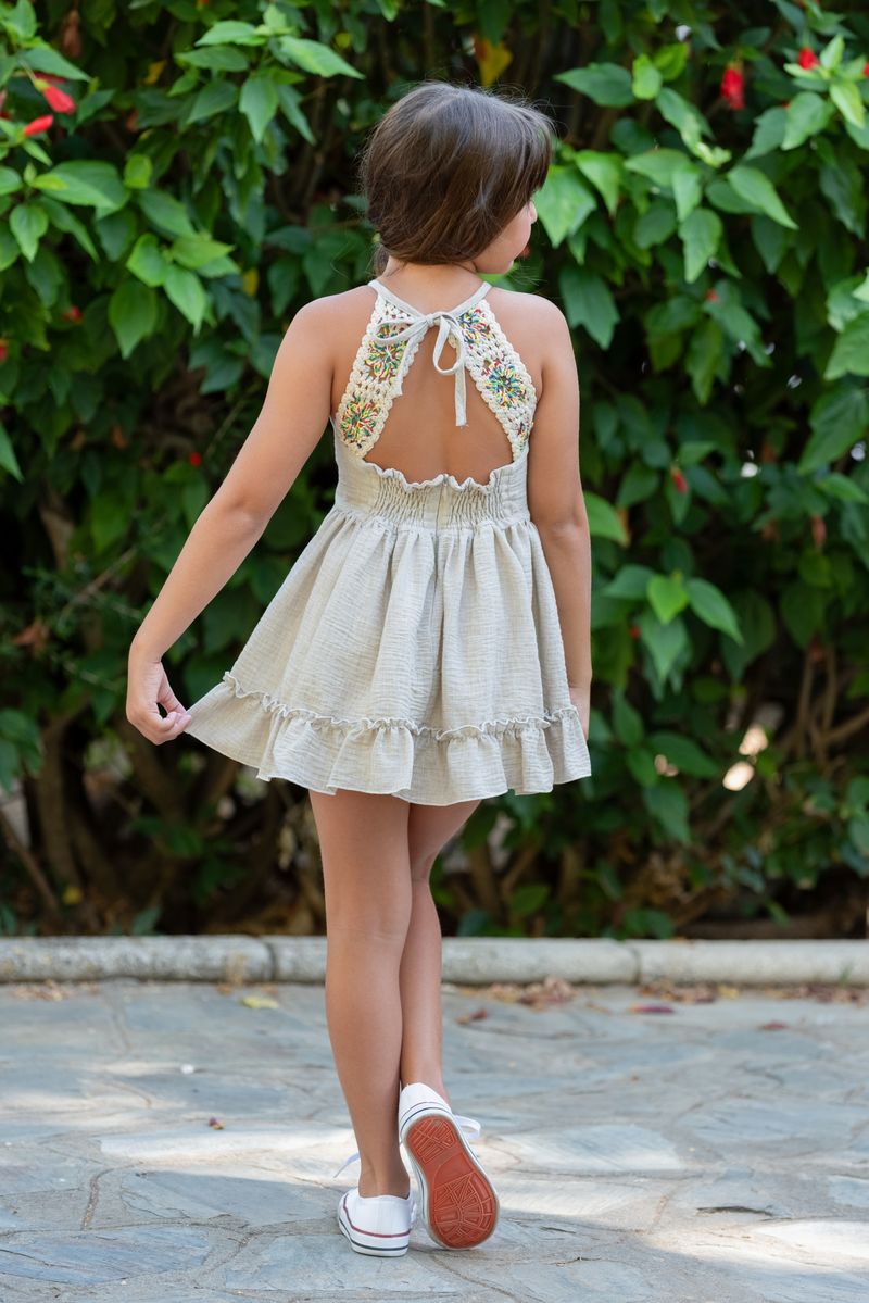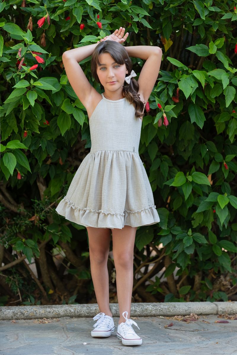 Vestido infantil de la marca Nekenia, ideal para ocasiones especiales o looks veraniegos con estilo natural. Confeccionado en un delicado tejido en tono beige, destaca por su diseño fresco y cómodo.
